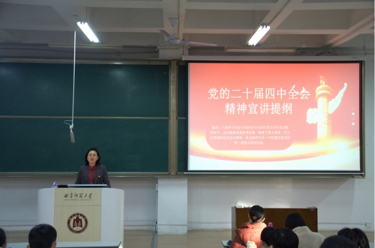 于JA105教室开展专题思政课,将2025-2026学年青马工程培训、第三十五期团校培训与入党积极分子培训有机融合,组织学生党员、”青马工程“学员及入党积极分子共同深入学习党的二十届四中全会精神。本次专题思政课由学院党委书记卢瑞霞主讲。