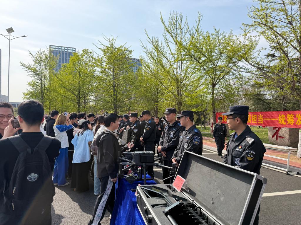 此外,同学们还参观了由日照市公安局到校展示的武器装备展,开启实践体验环节。现场各类武器装备整齐陈列,工作人员逐一讲解装备的性能、用途及背后的国防安全知识,让同学们直观感受我国国防力量的强大。参观过程中,同学们驻足观看、主动提问,近距离触摸国防装备、感受国防魅力,不仅进一步增强了民族自豪感和国防安全意识,更坚定了捍卫国家主权、安全、发展利益的坚定信念。此次装备展将抽象的国防安全知识转化为具象的实践体验,让知行课堂更具趣味性和感染力,有效激发了青年学生的爱国情怀和报国之志。